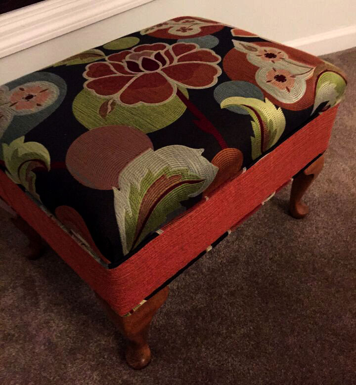Last year I started taking an upholstery class. The first project I took to work on was this foot stool that my Mom came across a few years ago. It had seen better days. The fabric was worn in some spots, the batting was no longer evenly distributed, and the pattern was outdated.